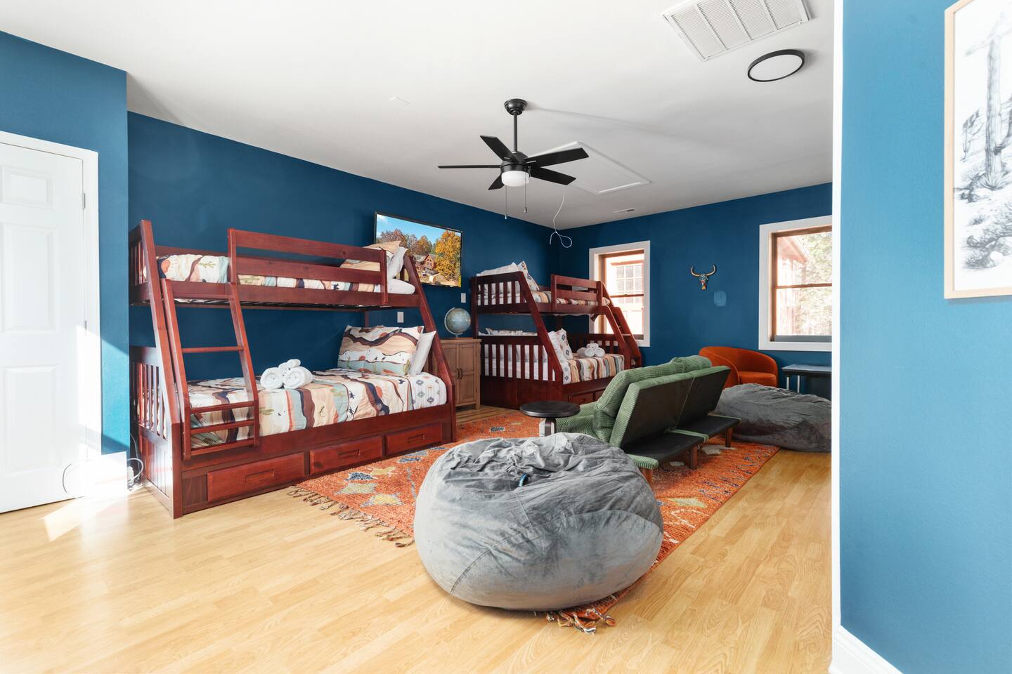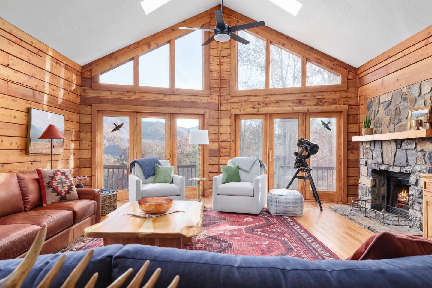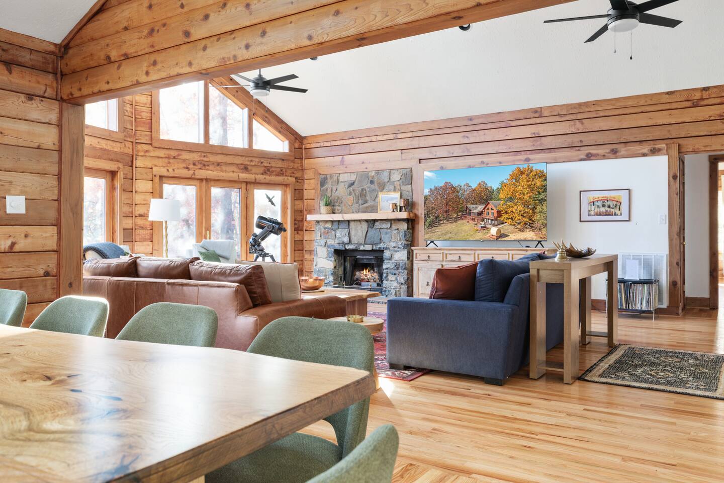 This 5-bedroom, 4-bath mountain home combines southwest rustic charm with modern comfort. Vaulted ceilings and expansive windows frame sweeping national park mountain views, while warm textures and southwestern-inspired décor create a sense of calm and connection. Layout highlights: - Main Level: Open-concept living room with floor-to-ceiling windows, gas fireplace, 85” Roku TV, and cozy seating area. Fully stocked kitchen with stainless appliances, large dining table (seats 10+). - Bedrooms: Five spacious bedrooms with high-quality mattresses and linens. Mix of king, queen, and twin over full bunk bed setups for flexibility. - Bathrooms: Four total, including three en suites with one having a soaking tub and double vanity. - Kids room/game room with TV, table top game system, books, board games, arts and crafts, and toys means rainy days can be the best days! Outdoor Spaces Step outside and you’ll understand why guests fall in love with this property: - Screened porch: Perfect for morning coffee or evening drinks without the bugs. - 8 person hot tub with mountain views - 4 person barrel sauna for a private spa-like experience - Firepit with Adirondack chairs, perfect for stargazing and s’mores -Blackstone grill and Ooni pizza oven make cooking for a crowd a breeze - Expansive deck for outdoor seating - Easy access gravel driveway (no 4WD required) Whether you’re roasting marshmallows, sipping wine as the sun sets, or watching the kids play on the lawn, the outdoors is as much a part of the experience as the home itself. Amenities ✔️ High-speed WiFi ✔️ Smart Roku TVs in all living and bedroom spaces ✔️ Full kitchen (with cookware, coffee station, and basic pantry staples) ✔️ Washer / dryer ✔️ Hot tub & sauna ✔️ Firepit + outdoor seating ✔️Blackstone grill and Ooni pizza oven ✔️ Screened porch + open deck ✔️ Free parking on-site ✔️ New HVAC ✔️ Self check-in via smart lock ✔️ Linens, towels, starter toiletries provided ✔️ Small children starter pack: pack and play, baby bath tub, high chair, and toys for all age ranges ✔️ Action packed kids room: Arcade style table top gaming system, TV, bean bags, and futon ✔️ Location Located just minutes from Shenandoah National Park and Luray Caverns, this cabin offers both seclusion and convenience. Enjoy scenic drives on Skyline Drive, local wineries, hiking trails, and charming small-town restaurants — all within 15–20 minutes. Our Promise We built this retreat to be the kind of place we’d want to escape to with our own family, a blend of comfort, adventure, and connection. Whether you’re here for a quick recharge or a weeklong stay, we hope Shenandoah Overlook Lodge becomes a place you’ll want to return to year after year.